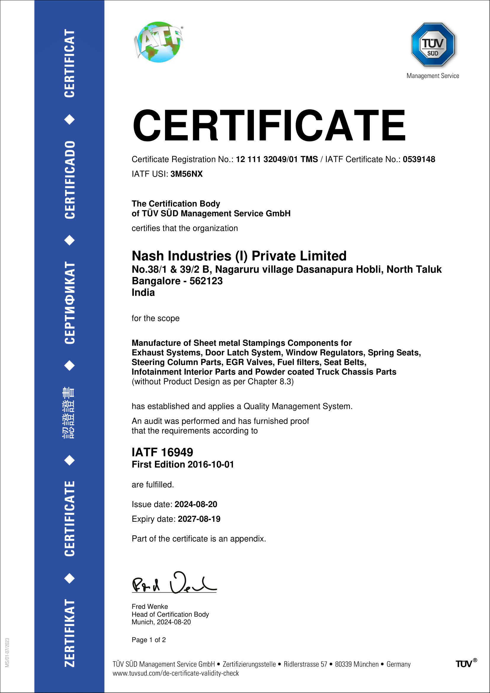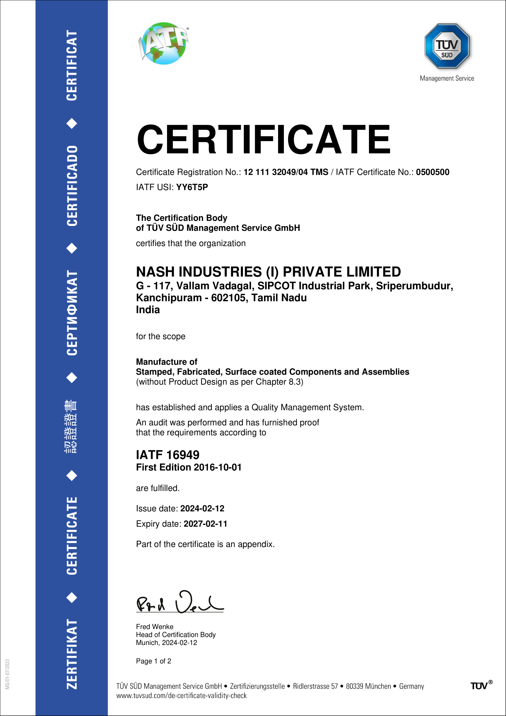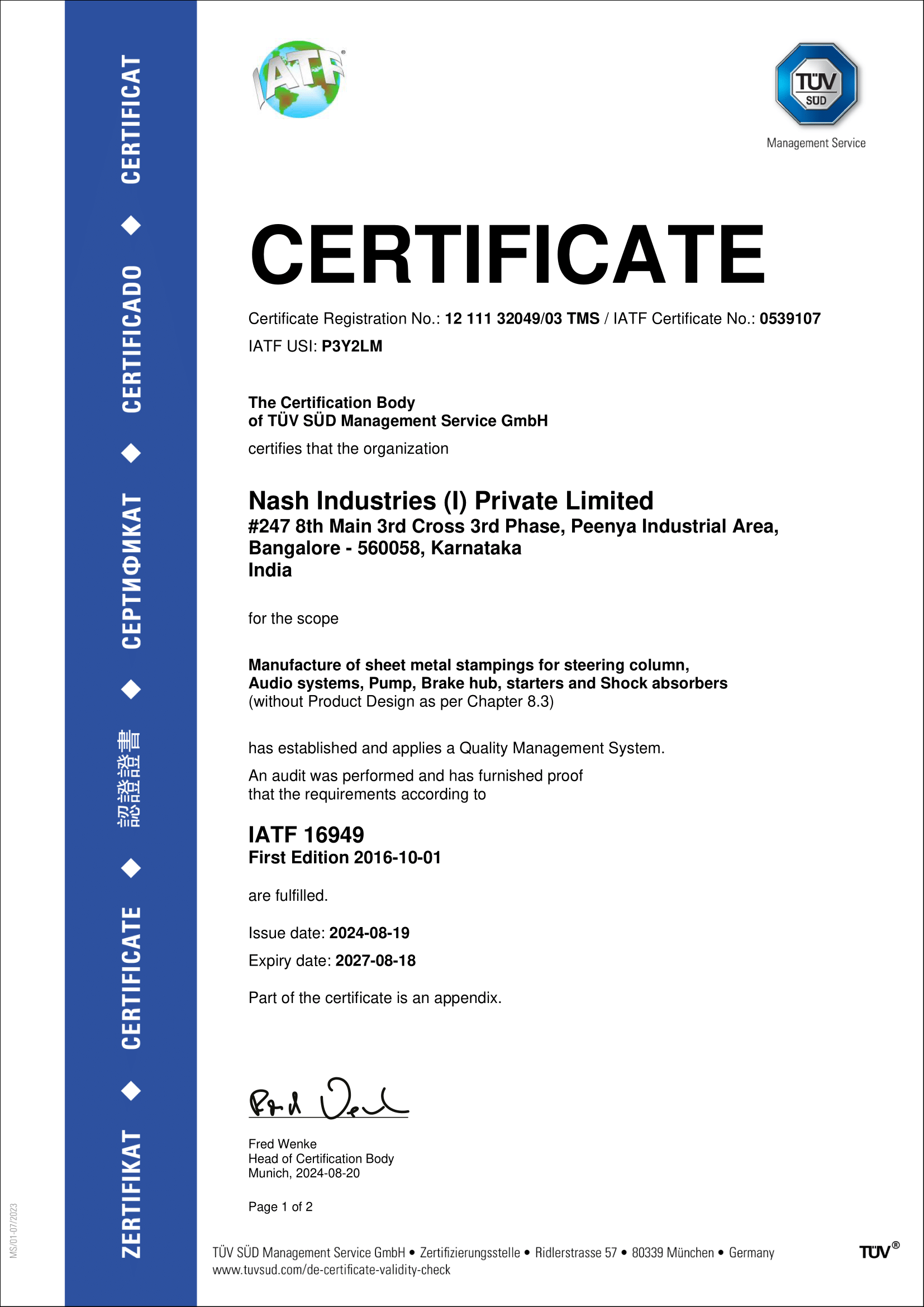 IATF 16949 certificate - Nash Chennai