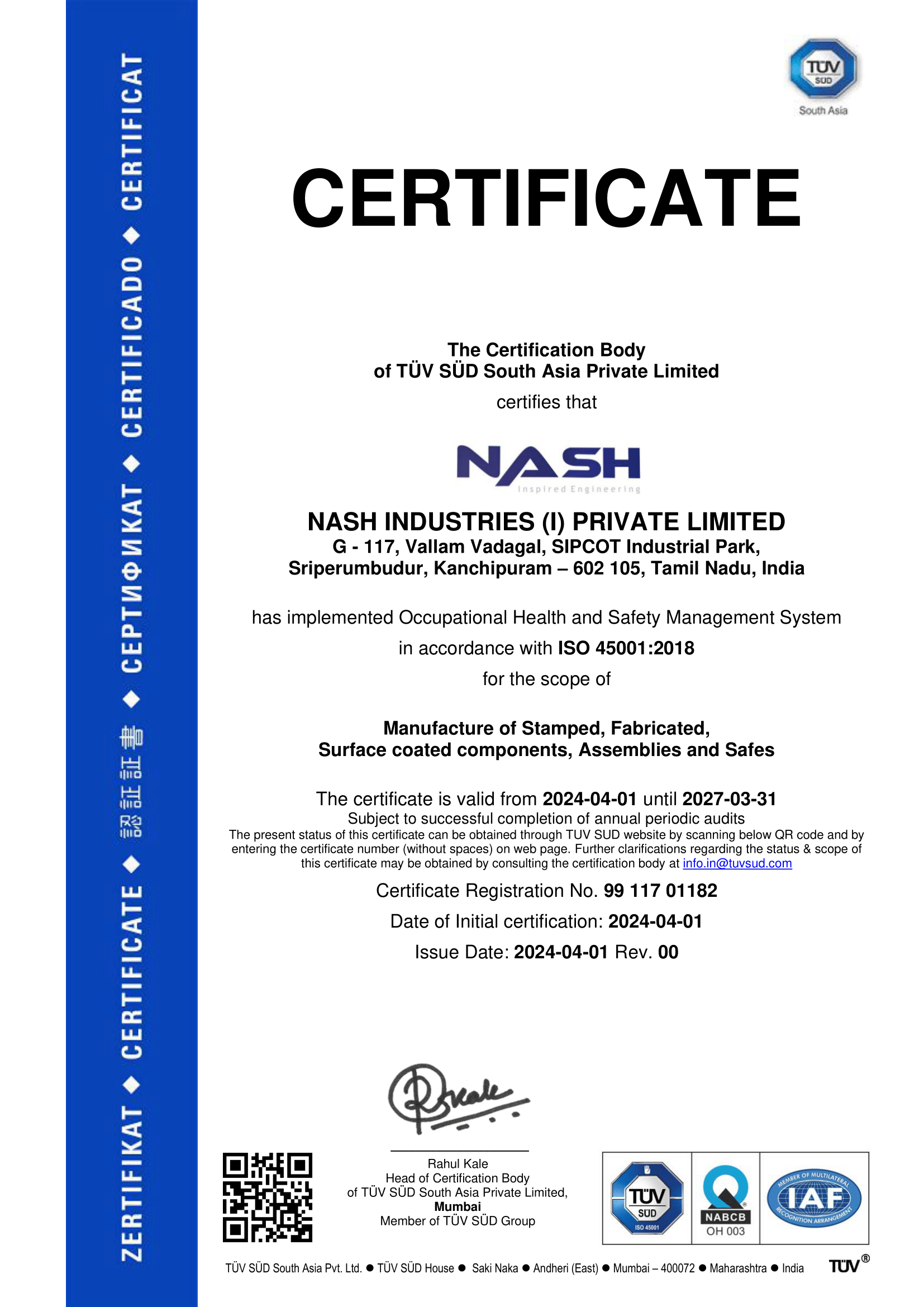 ISO 45001 certificate - Nash Chennai plant